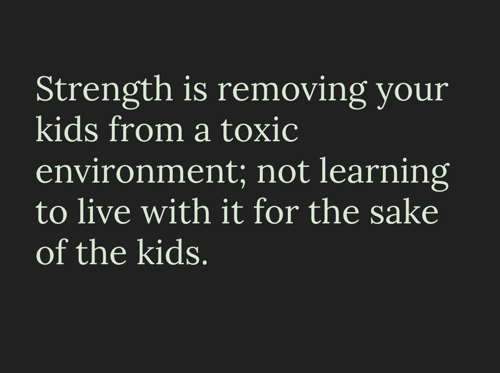“The kids may never have a dad who is consistently interested in them and psychologically safe, but they can have a mom whose not consumed by protecting them from a toxic father.” – Me